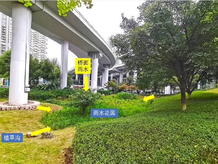 兩江新區五里店立交提質增效一期,該項目在改造中落實海綿理念,花小錢辦大事;借助橋下坡地空間,于坡地低洼地帶設置雨水花園,收水順暢;橋面徑流經落水管收集后斷接,在斷接處設置消能設施,減少沖刷;周邊綠地徑流經植草溝自然匯流至雨水花園凈化處理。