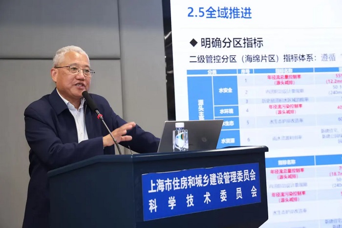 海綿城市建設是城市尺度的系統工程,需要多專業協同。全國工程勘察設計大師、海綿城市建設工程技術創新中心主任張辰在會上首先系統闡述了全域海綿城市建設的技術邏輯、實施路徑與長效機制。在介紹上海“十四五”海綿城市建設取得的顯著成效時,他詳細解讀了2030年新增450平方公里達標區等目標規劃,以及四類管控分區的差異化指標制定,并分享了通過源頭減排、過程控制、系統治理全鏈條推進的多個海綿改造實例,為超大城市海綿城市建設提供了權威技術示范。